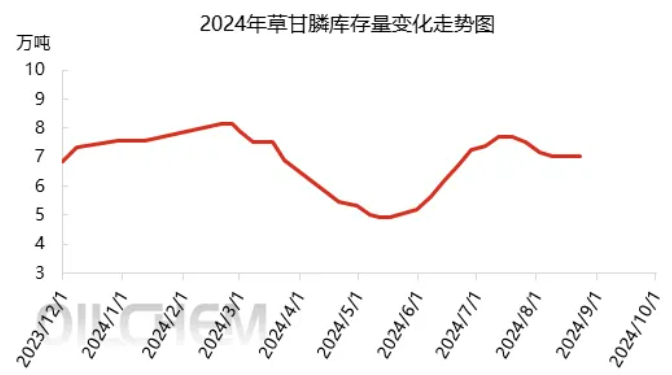 综上,国内制剂订单一般,原药采购按需为主,草甘膦多数工厂维持高负荷开工,西南地区部分降负荷运行,整体草甘膦供应面维持高位。需求端稍显弱势,内销淡季,外贸少量跟进,销售及库存压力持续,叠加草甘膦调价函刺激,市场情绪拉动明显,草甘膦走势坚挺,截止2024年9月4日95%草甘膦原药报价至2.5万元/吨,企业看涨预期积极,预计短期草甘膦走势稳中向好,价格或小幅抬涨。